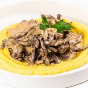 Бефстроганов с грибами на подушке из картофельного муслина